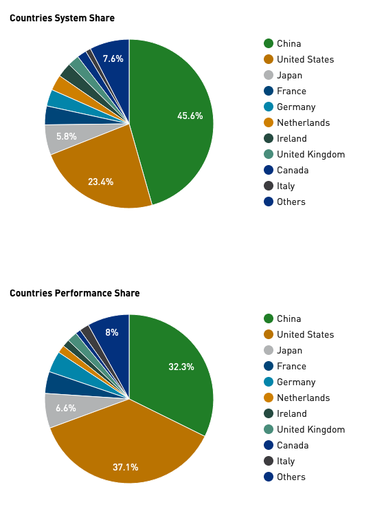 The share of installations in China continues to rise strongly. 45.6 % of all system are now listed as being installed in China. The share of system listed in the USA remains near it's all time low at 23.4 %. However, systems in the USA are on average larger, which allowed the USA (37.1%) to stay close to China (32.3%) in terms of installed performance.